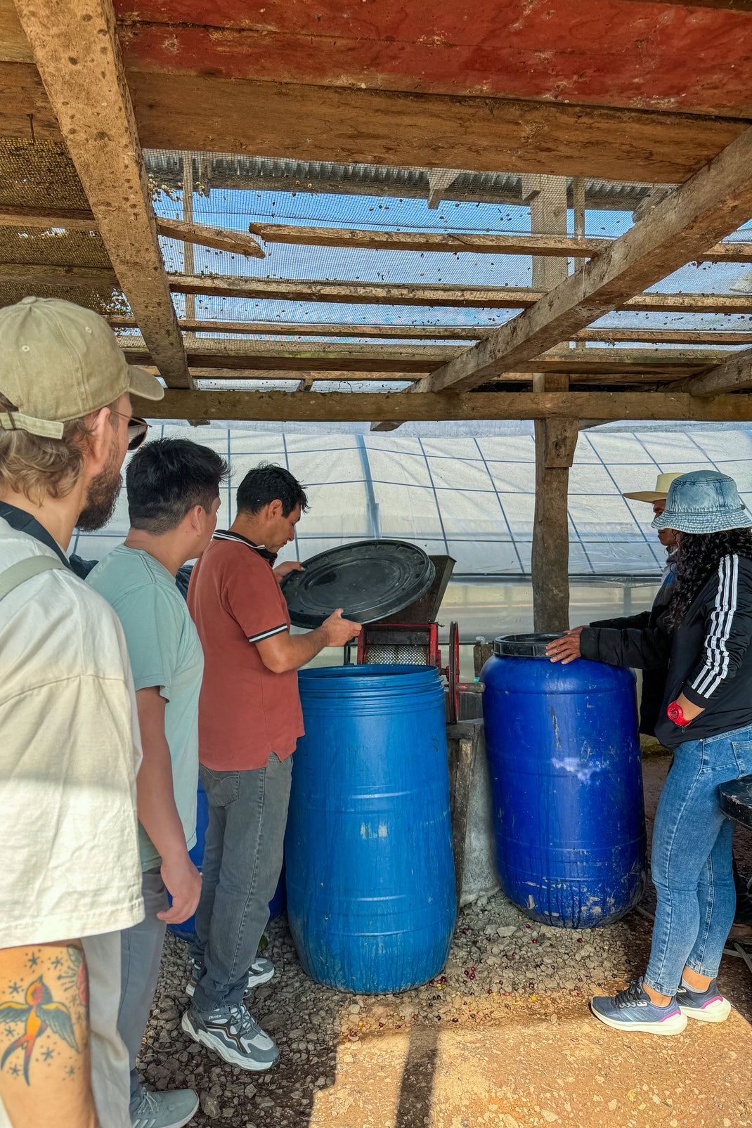 Coffee is very much a family affair here. All eight of Don Angel’s now adult children are involved in one way or another. Damian showed us his fermentation tanks – one of them holding a Geisha fermenting for 70 hours – as well as the drying rooms. After the farm tour, we sat together in front of the house to talk business. Damian is ambitious: he wants to experiment, improve quality and market his coffees better. The OCL team asked questions, gave feedback and openly discussed possible improvements.