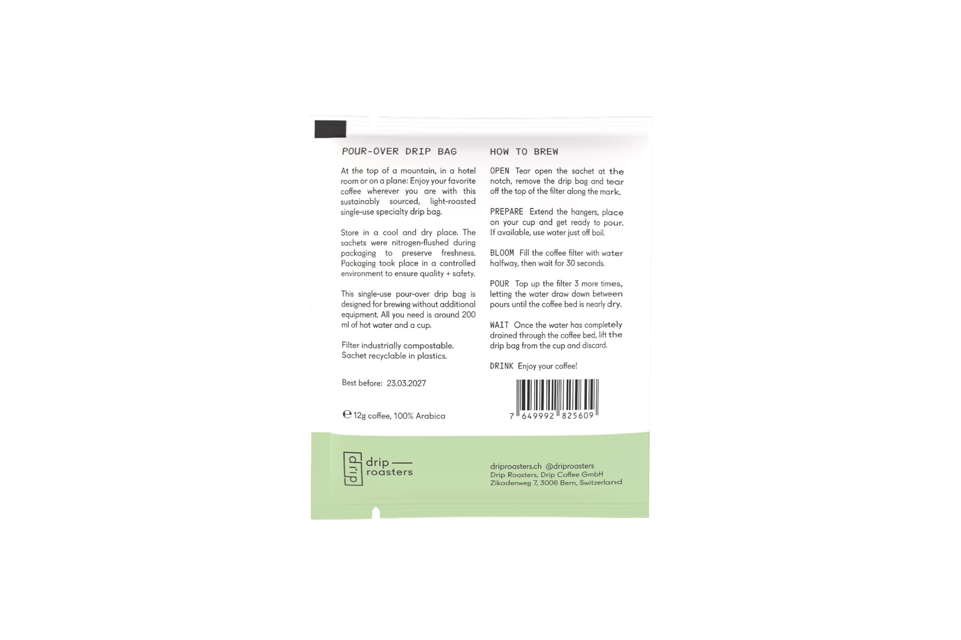 Die Drip Bags werden beim Verpacken mit Stickstoff behandelt – das schützt das Aroma und macht sie 12 Monate haltbar. Der Filter ist industriell kompostierbar, die Verpackung kann im Kunststoffrecycling entsorgt werden.