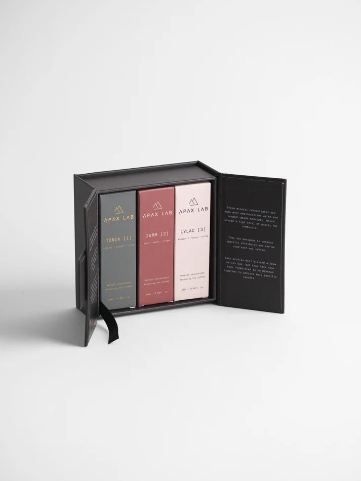 Created for championships, training programs – or simply to have fun with recipes, this set contains three different mineral concentrates. Each one was developed to enhance different characteristics of your cup of coffee. The concentrates were formulated with demineralized water and precise mineral blends. The three types are: